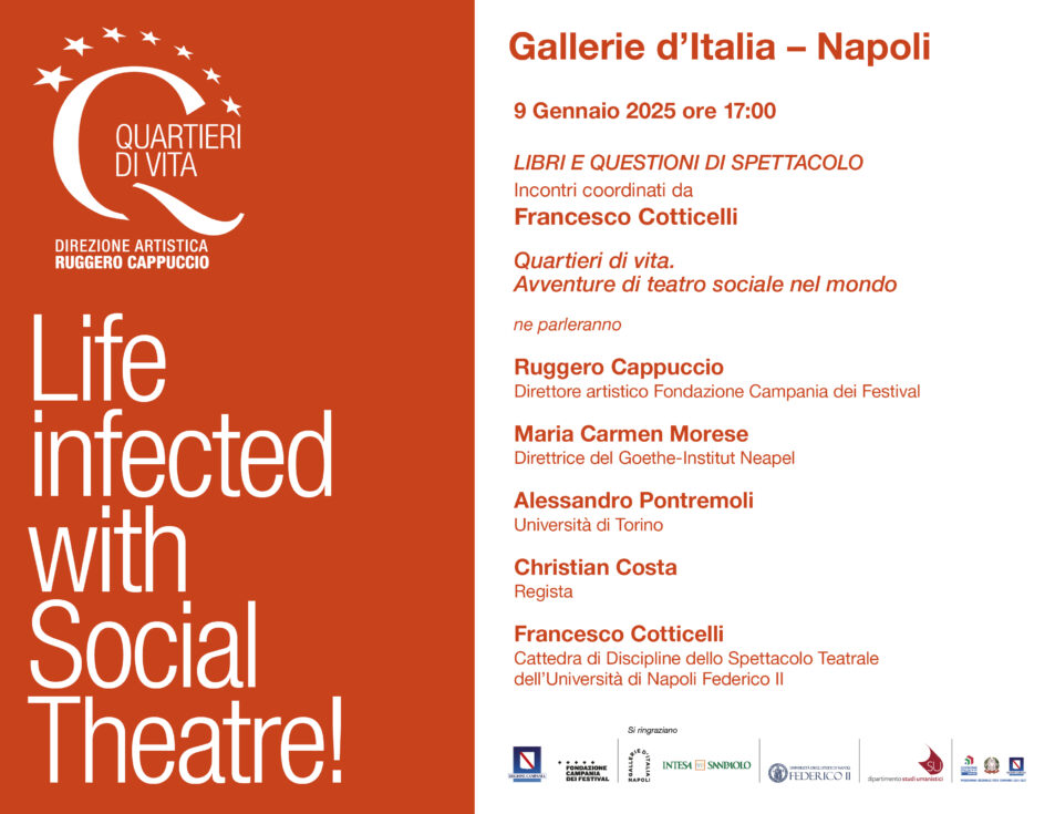 Il prossimo 9 gennaio 2025, alle ore 17:00 presso le Gallerie d’Italia in Via Toledo, si terrà la presentazione del volume dedicato al progetto Quartieri di Vita. Life infected with Social Theatre, nell’ambito degli incontri “Libri e questioni di spettacolo” coordinati dal prof. Francesco Cotticelli (Discipline dello Spettacolo Teatrale, Università Federico II).