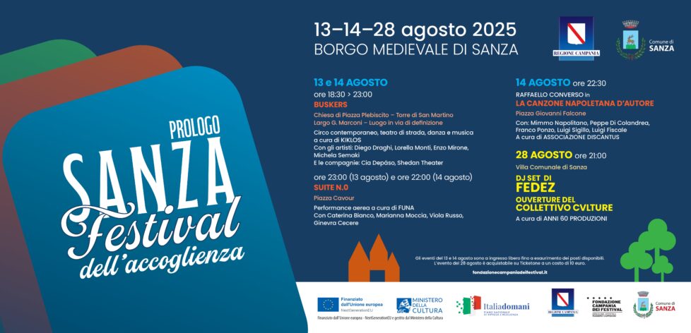 Nei giorni 13, 14 e 28 agosto 2025, Sanza si prepara a trasformarsi in un palcoscenico diffuso, ospitando il prologo di un nuovo evento culturale che anticipa il “Sanza – Festival dell’accoglienza”, la cui prima edizione ufficiale è prevista per il 2026 nel borgo cilentano. Un progetto in collaborazione tra il Comune di Sanza (SA) e la Regione Campania attraverso la Fondazione Campania dei Festival, nell’ambito delle iniziative ammesse ai fondi PNRR – Piano Nazionale di Ripresa e Resilienza e finanziate dall’Unione europea – NextGenerationEU.