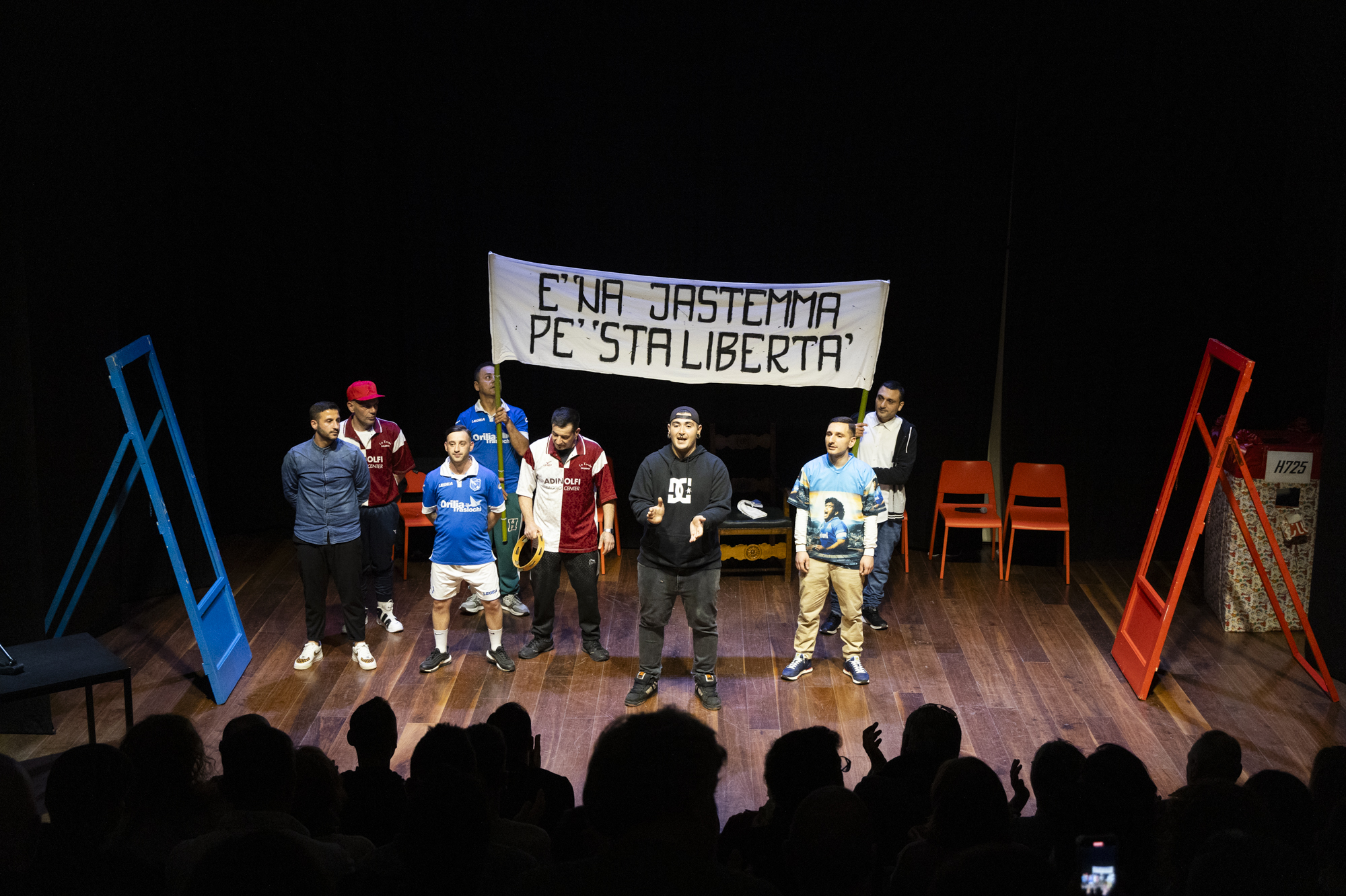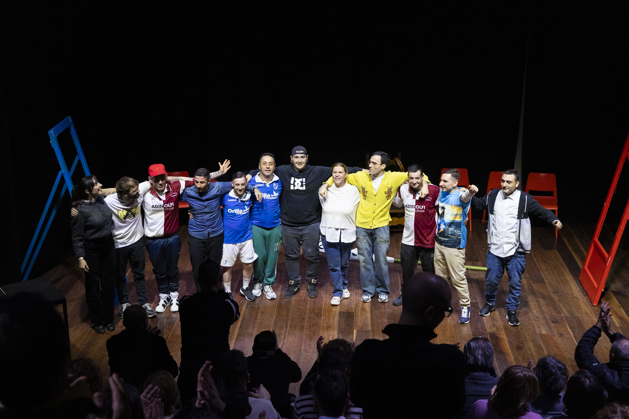 Quand’è che inizia il gioco? Magari solo con un passaggio, da una persona ad un’altra, da uno spazio all’altro, un passaggio di parola, di pallone, di parte… Poi ci possono essere reti, squadre, canestri, stadi, carte, dadi… o semplicemente un palco. Un palco come un campo dove scambiarsi battute, storie, identità…